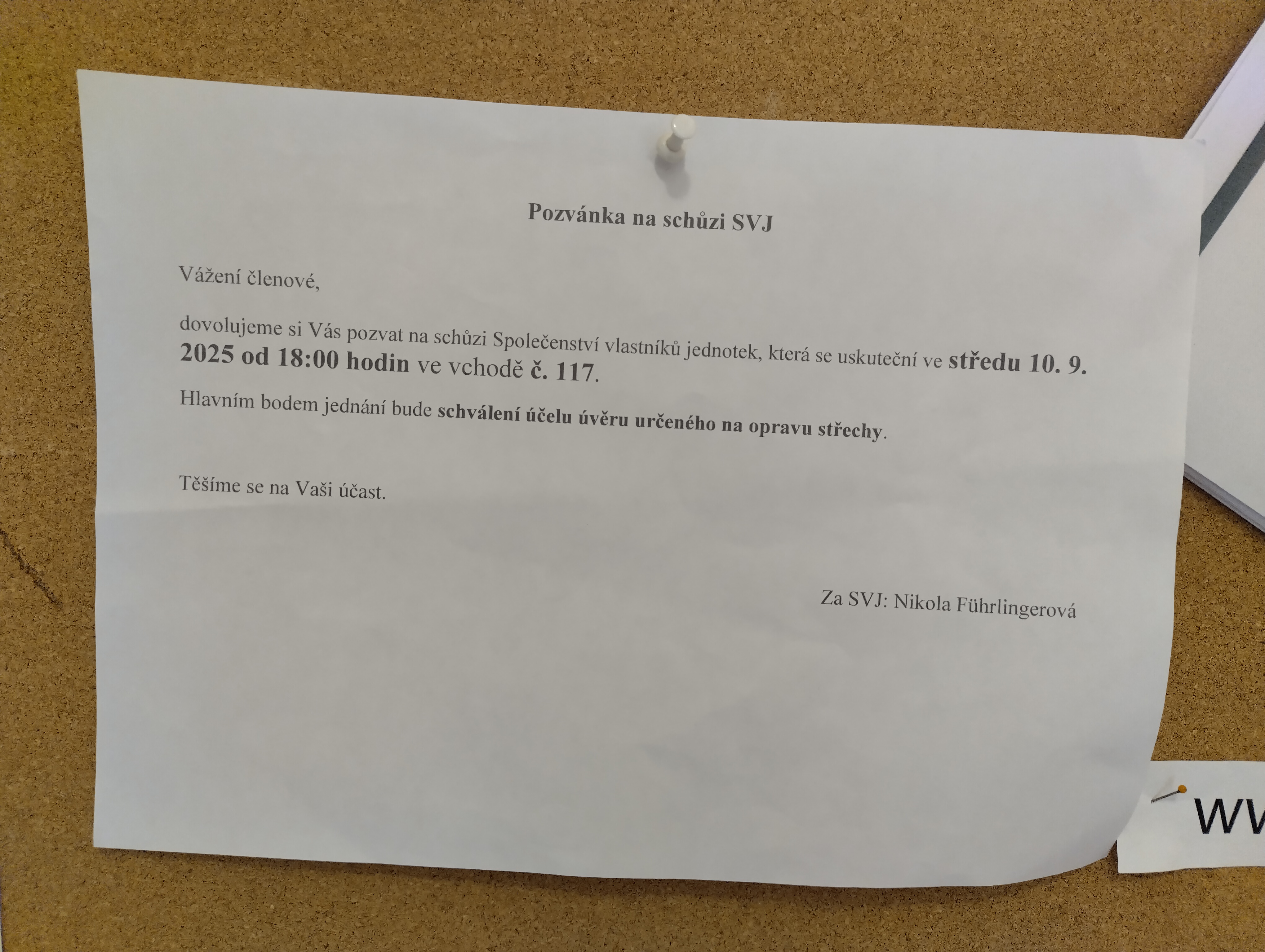 Ve středu 10. září 2025 v 18:00 proběhla v přízemí vchodu č. 117 schůze společenství vlastníků jednotek. Na programu schůze bylo projednání nabídky financování opravy střešní hydroizolace a schvalování cenové nabídky na vícepráce na stříškách stupaček. Ze schůze byl pořízen zápis.