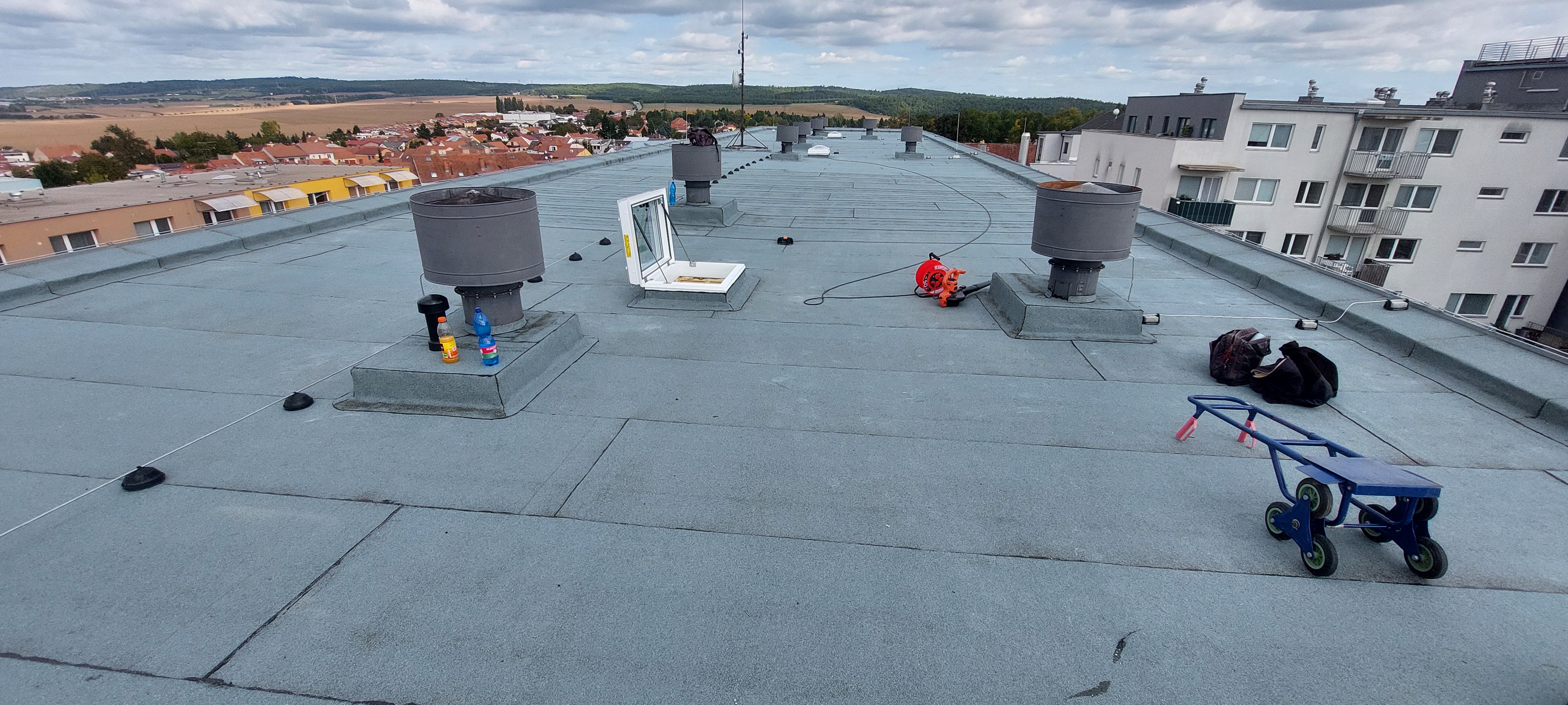 Na základě obdrženého protokolu o stavu střešní hydroizolace jsme společně s Matějem Pěnčíkem provedli zatmelení označených míst na krycím povrchu střechy. Společně se Zdeňkem Poulíkem nyní poptáváme cenové nabídky na celkovou výměnu střešní hydroizolace.