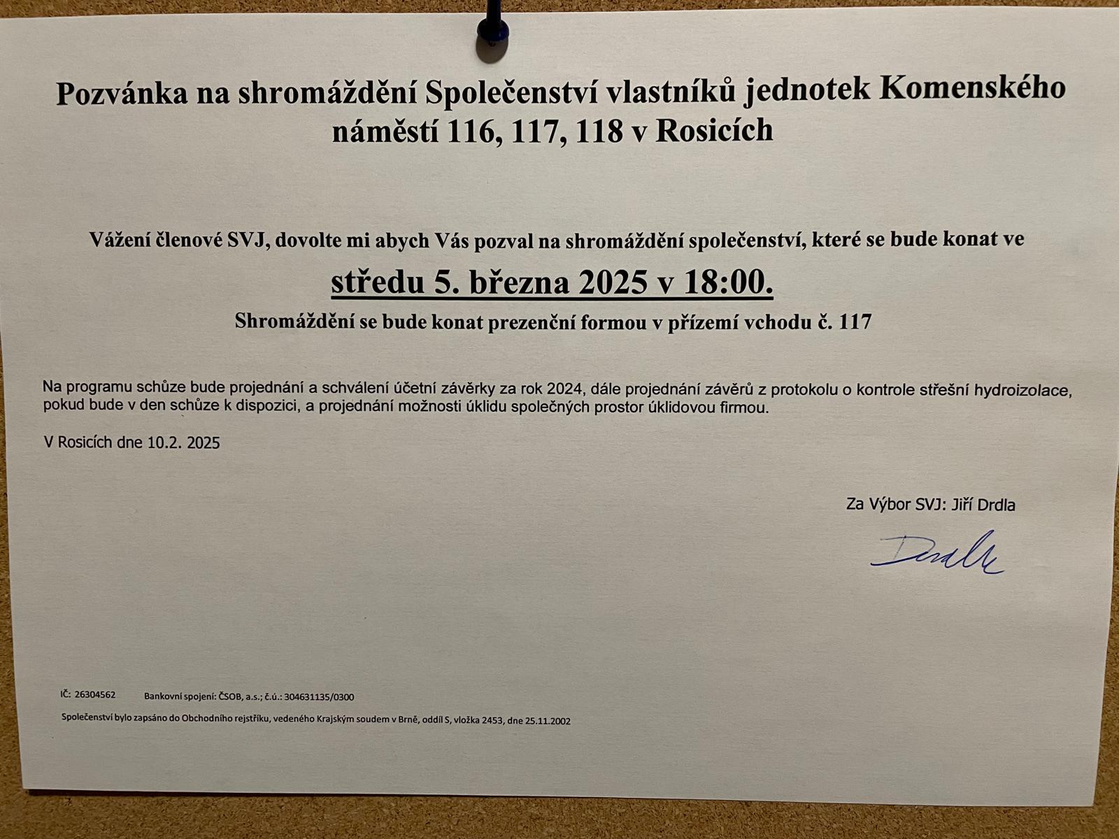 Ve středu 5. března 2025 v 18:00 se v přízemí vchodu č. 117 konala schůze společenství vlastníků. Na programu schůze bylo projednání a schválení účetní závěrky za rok 2024, dále projednání závěrů z protokolu o kontrole střešní hydroizovalce a projednání možnosti úklidu společných prostor úklidovou firmou. Ze schůze byl pořízen zápis.